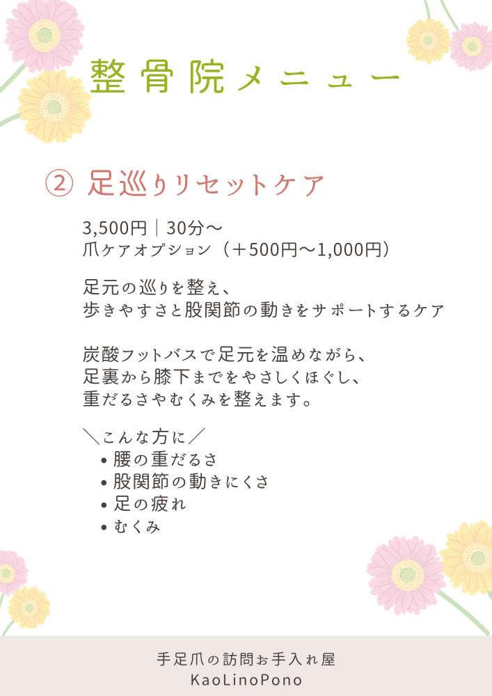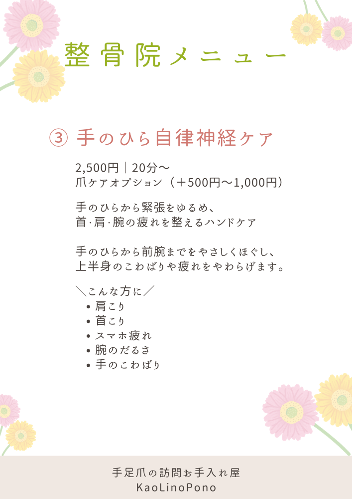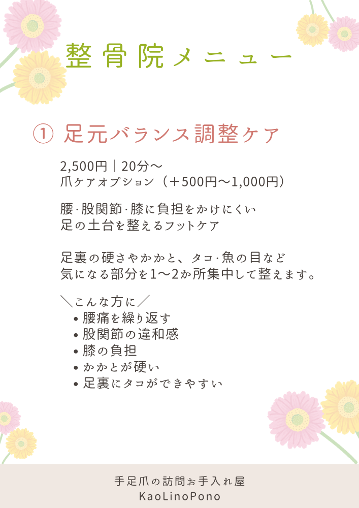 火曜日または土曜日(不定期)に宗像市の【はる風整骨院】にて出張ケアを行っています。「予防・機能・巡りケア 」中心の限定メニューです。整骨院をご利用中の方も、ケアのみでご来店の方も、どなたでもご利用いただけます。身体を整えるケアとあわせて、手足や爪も一緒に整えてみませんか?ご来店を心よりお待ちしております。ご予約・ご相談は公式LINEより承ります。
